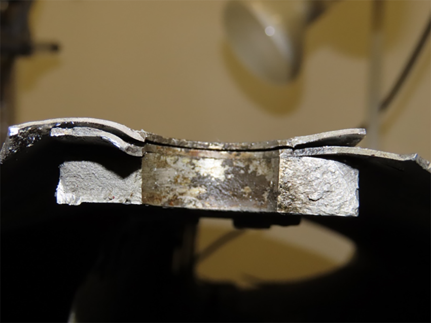 The inspection of the failed lower strut lug plate revealed fatigue cracking across the aluminum surface on the trailing edge side of the bolt bore. The fatigue crack originated at the bottom of the bolt bore and propagated over time until the remainder of the lug plate failed under overload forces during the occurrence flight (Figure 2 and Figure 3).