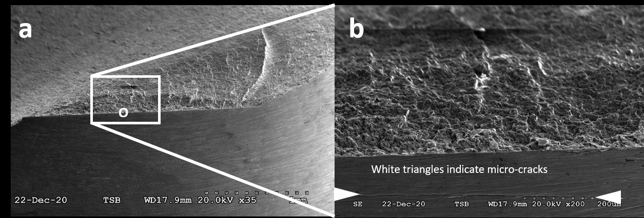 Micrographs of the fatigue origin area taken with a scanning electron microscope revealed that an initial, fingernail-shaped fatigue crack (Figure 3a) started from an almost straight line on the pin surface. Approximately parallel to this line, there were several small, straight micro-cracks (Figure 3b) on the pin surface in the chromium coat. The cracks were likely deep enough to penetrate into the steel core of the pin. The cracks likely developed from bending deformation and served as the fatigue origin that led to the eventual fracture of the blade actuating pin. The micro-cracks were sub-millimetre in length and are too small to be detected by magnetic particle inspection (MPI). No such cracks were found on blade actuating pins of the No. 1 or No. 3 propeller blades.