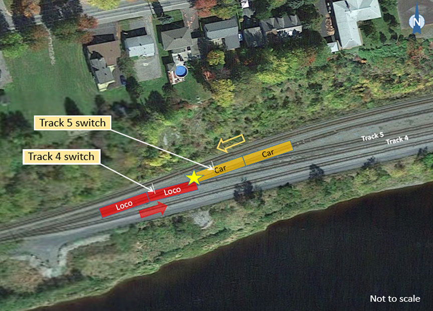 On 04 December 2018, at about 0825 Atlantic Standard Time, a Canadian National Railway Company (CN) yard assignment (assignment) was switching cars at Edmundston Yard in Edmundston, New Brunswick. The assignment crew consisted of a locomotive engineer, a conductor and a conductor trainee (trainee). During switching operations, 2 cars that had been placed on track EA14 (west-end yard lead) started to roll uncontrolled back towards the assignment, resulting in a collision with the assignment’s trailing locomotive (Figure 1). The trainee, who was standing on the side ladder of the trailing locomotive, sustained fatal injuries (TSB Occurrence No. R18M0037).