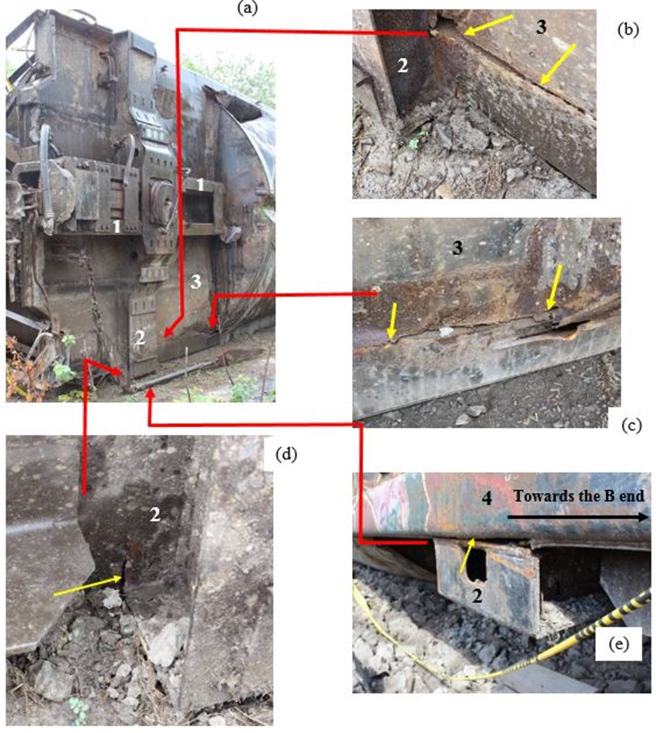 (a) Bottom of B-end showing stub sill and car body bolster; (b) and (c) Zoomed views of cracks found on the shear plate (yellow arrows); (d) and (e) cracks found in the joint between the car body bolster and side sill (Source: TSB)