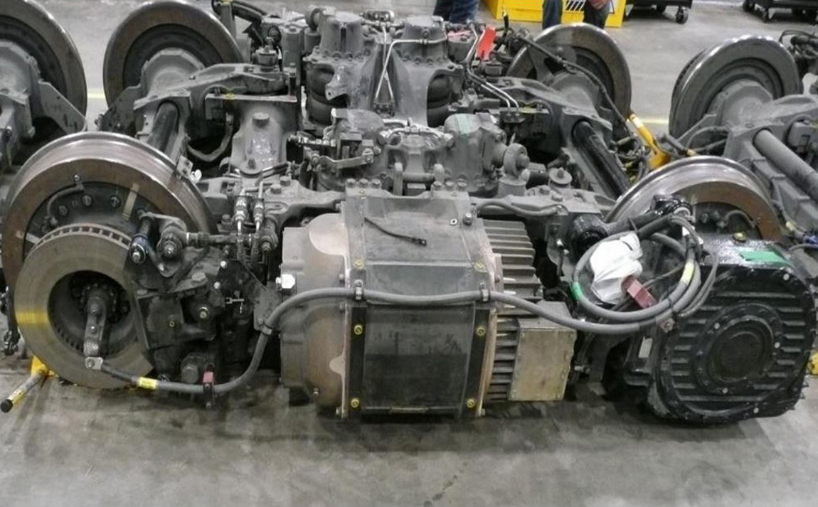 Among other components, each bogie is equipped with 4 resilient wheel assemblies and 2 axle assemblies. Each axle assembly includes 2 wheel hubs and 2 cartridge roller bearing sub-assemblies (cartridge assemblies) connected by a solid splined axle (Figure 3). The wheels are secured to the exterior of each hub by bolts to complete the bogie assembly. The axle transmits the weight of the vehicle to, and provides a smooth rolling movement for, the wheelset.