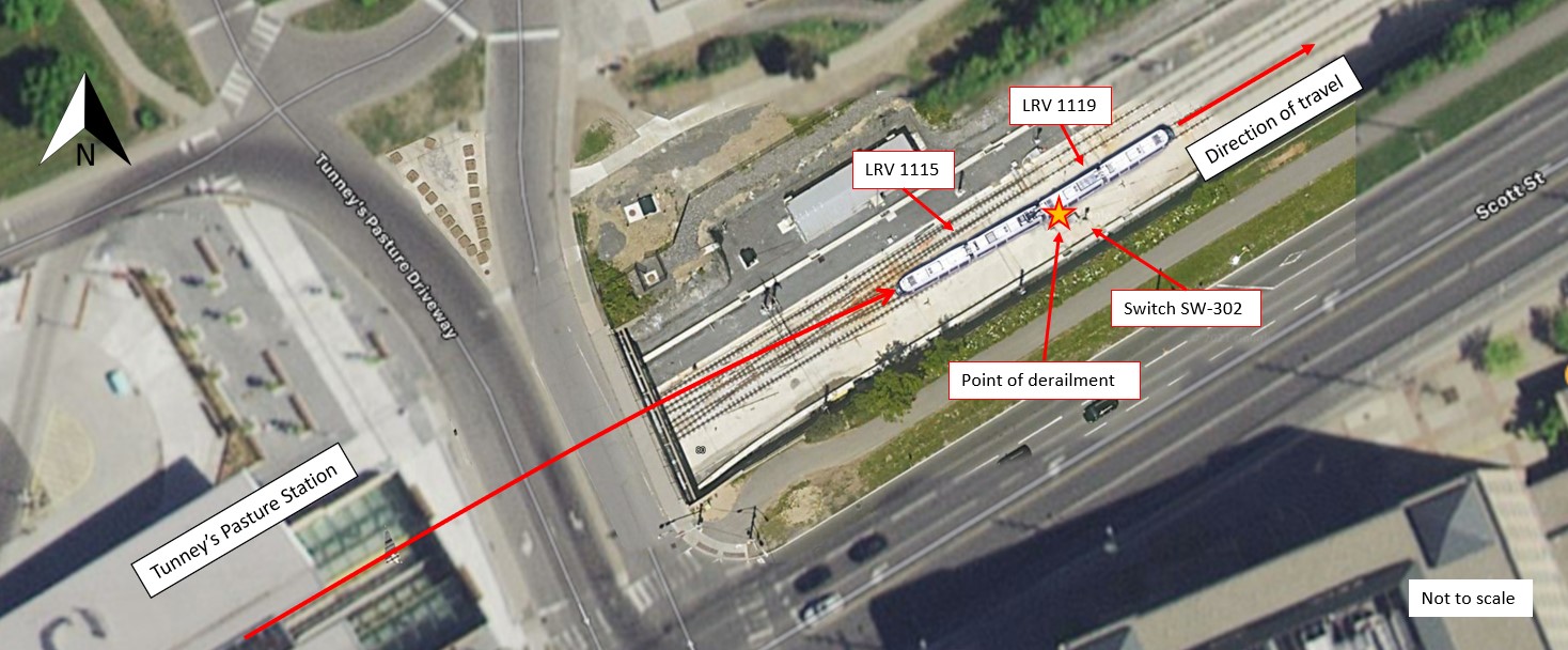 On 08 August 2021 at about 2034,Footnote 3 an eastbound OLRT commuter train (the train) was proceeding from the north track to the south track over the SW-302 south crossover switch at a speed of about 30 km/h when it derailed about 90 m east of Tunney’s Pasture Station in Ottawa, Ontario (Figure 4). There were no passengers on board at the time of the accident.