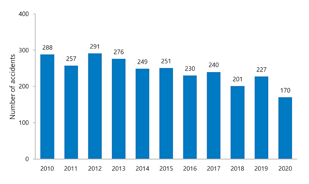 In 2020, a total of 170 air transportation accidents were reported to the TSB (Table 1 and Figure 4). This number is 25% lower than the previous year’s total of 227 accidents and 32% below the average of 251 accidents reported in the prior 10 years, 2010 to 2019. Most (165) of the accidents in 2020 took place in Canada and involved Canadian-registered aircraft. Five accidents involving Canadian-registered aircraft took place outside Canada, and no accidents in Canada involved foreign-registered aircraft. In general, the number of air transportation accidents has been decreasing in the last decade.