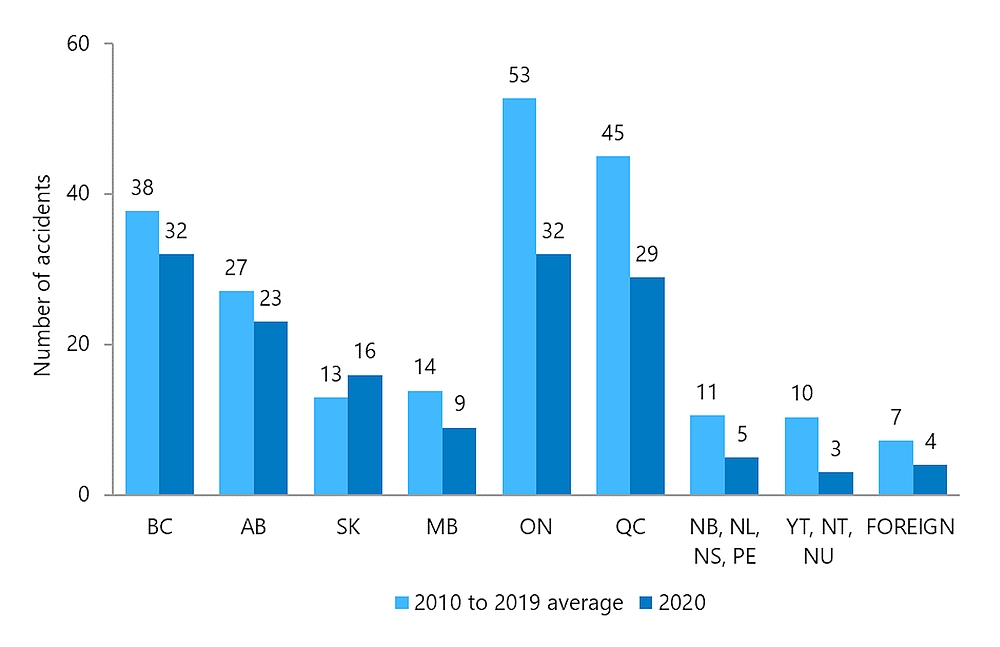 Ontario, with 39 reported accidents (all aircraft types, including ultralights), was the province with the largest number of reported accidents in 2020, as it was in the previous 3 years (Table 7; data not shown). Ontario also averaged more accidents per year (63) in the 2010–2019 period than any other province or territory, with Quebec having the second-largest average accident count (54) for the same period. British Columbia and Alberta also have high average accident counts compared with the remaining provinces and territories.