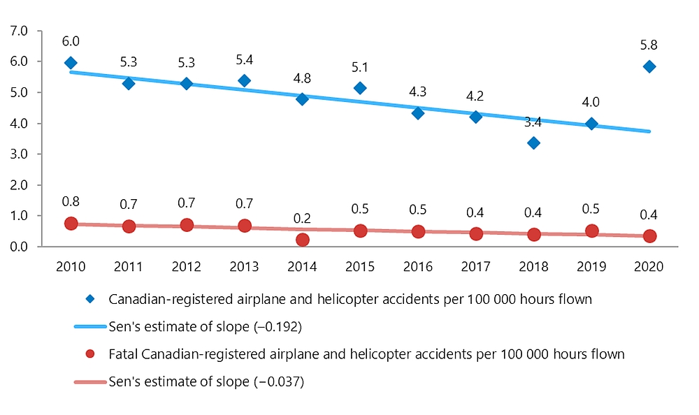 The statistics presented here reflect the TSB Aviation Safety Information System (ASIS) database at 9 April 2021. Since the occurrence data are constantly being updated in the live database, the statistics may change slightly over time.