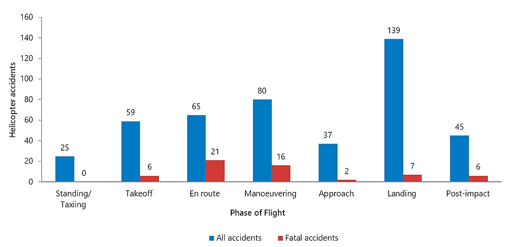 Of the 170 air transportation accidents reported to the TSB in 2020, 133 (78%) involved fixed-wing, powered airplanes (other than ultralights) (Table 1), 16 (9%) involved helicopters, 17 (10%) involved ultralights, and 4 accidents (2%) involved other types of aircraft. In the 10 years from 2010 to 2019, the average proportion of accidents involving each of these 4 types of aircraft has remained fairly constant: airplanes have been involved in roughly 75% of reportable accidents each year, helicopters in about 12% of accidents, ultralights in about 10%, and other aircraft in about 3% of accidents each year.