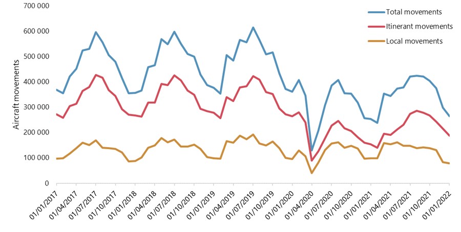 Overall, aircraft movements at the 90 airports serviced by NAV CANADA reached 4.29 million in 2021, up 11.8% from 3.84 million in 2020. Compared with 2019 (before the pandemic), total aircraft movements in 2021 were down 26.8%. This figure is indicative of a partial recovery of activity in the commercial sectors responsible for air travel, air cargo, aerial work, and flight training. The numbers presented above also include recreational aviation activity at major airports. However, it is difficult to estimate the amount of activity – commercial or private – at small airports in Canada, or off-airport entirely, and therefore a full picture of aviation industry activity is lacking. Nonetheless, these activity patterns are informative, and give partial context to the accident statistics discussed in this document.