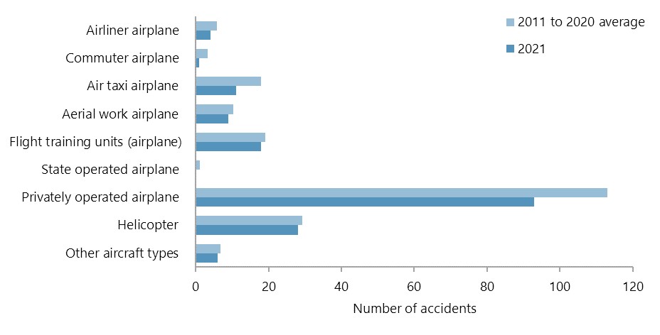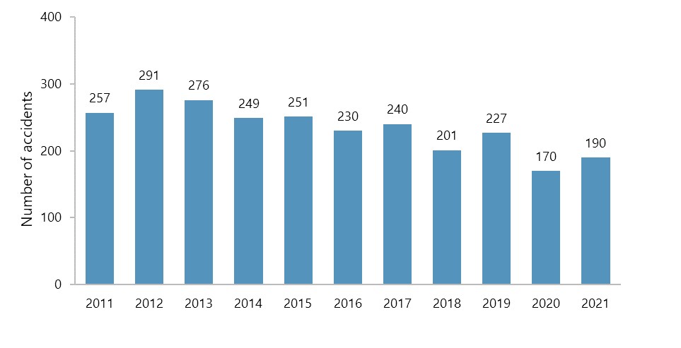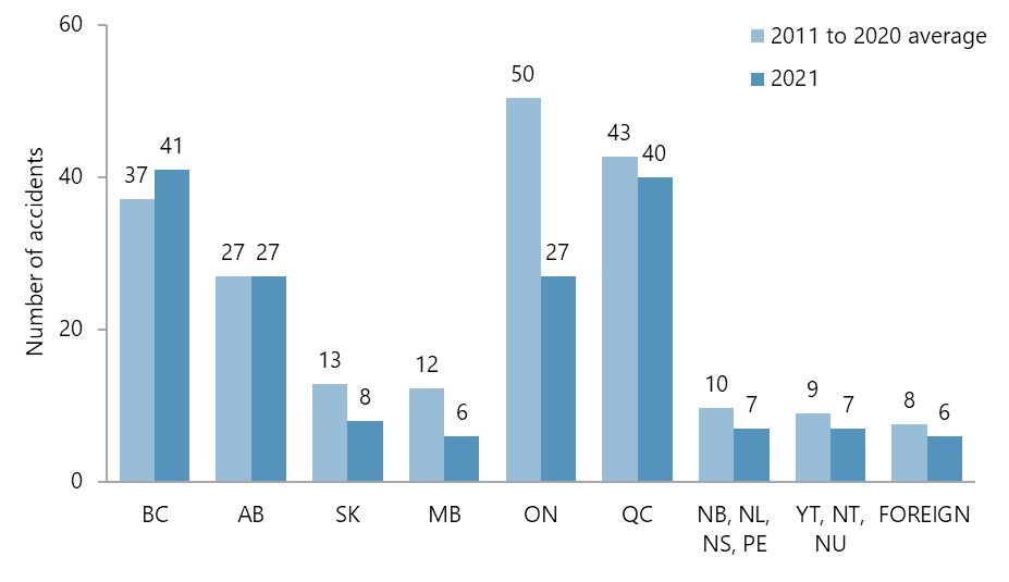 In 2021, a total of 190 air transportation accidents were reported to the TSB (Table 1 and Figure 3). This number is 12% higher than the previous year’s total of 170 accidents but 21% below the yearly average of 239 accidents reported in the prior 10 years, 2011 to 2020. Most (183) of the accidents in 2021 took place in Canada and involved Canadian-registered aircraft. Six accidents involving Canadian-registered aircraft took place outside Canada, and one accident in Canada involved a foreign-registered aircraft. In general, the number of air transportation accidents has been decreasing in the last decade.
