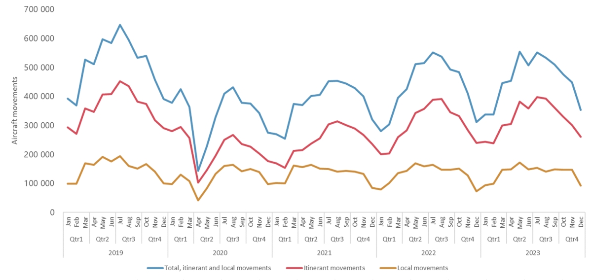 Air transportation in Canada continued to rebound in 2023, after 3 years of significant disruption. Year-over-year demand for business and vacation travel increased and cargo activity remained high. Information collected by Statistics Canada indicates that total aircraft movements (take-offs and landings) at Canada's major and selected small airports numbered 5.5 million, which was 5.5% higher than in 2022 and represented 89.6% of the pre-pandemic movements in 2019. While activity at Canada’s major and selected small airports is documented, it is difficult to estimate the amount of activity—commercial or private—at many small airports in Canada or off-airport entirely. Therefore, a full picture of activity in the aviation industry is lacking. Nonetheless, the activity patterns discussed here are indicative, and give partial context to the accident statistics presented in this document.