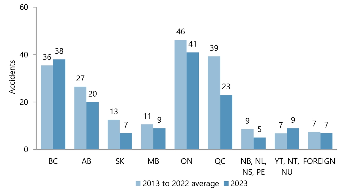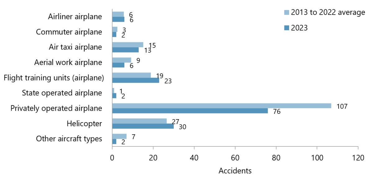 A total of 182 accidents were reported in 2023. This number is 10% higher than the previous year and 17% below the yearly average of 220 accidents reported in the prior 10 years, 2013 to 2022. Most (169) of the accidents in 2023 took place in Canada and involved Canadian-registered aircraft. In general, the number of air transportation accidents has decreased in the last decade.
