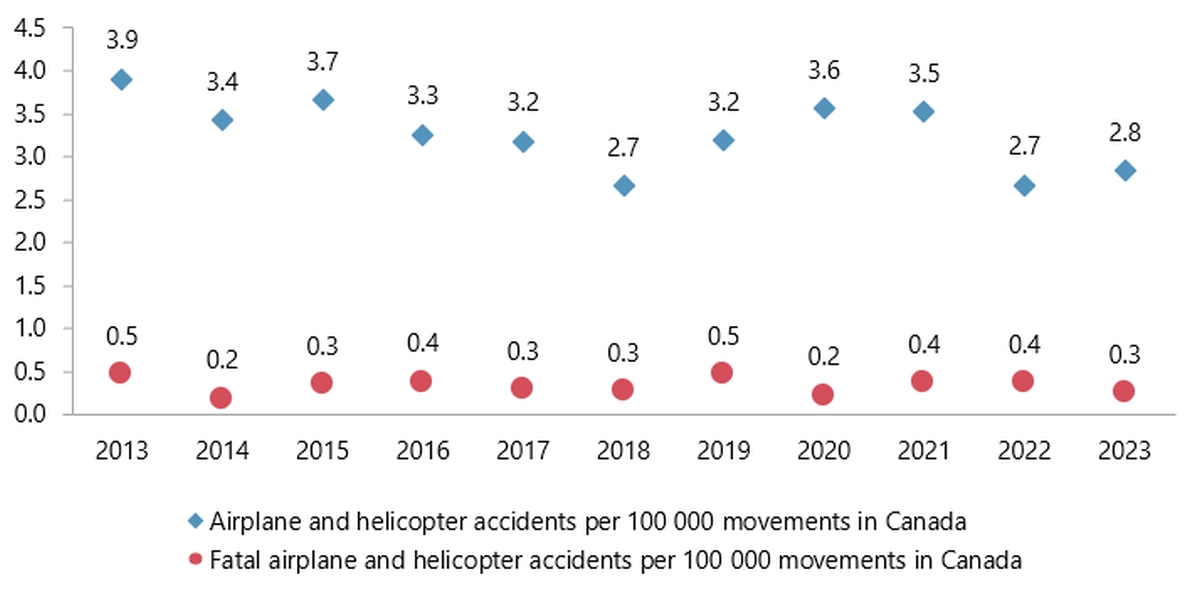 The 2023 overall air transportation accident rate of 2.8 per 100 000 aircraft movements is among the lowest recorded by the TSB since it began measuring accident rate by movements in 2004. This accident rate was calculated based on the 156 accidents (12% more than in 2022) in Canada involving Canadian-registered and foreign airplanes and helicopters (ultralights and other aircraft types are excluded), and the estimated 5 502 000 aircraft movements at Canadian airports (6% more than in 2022).