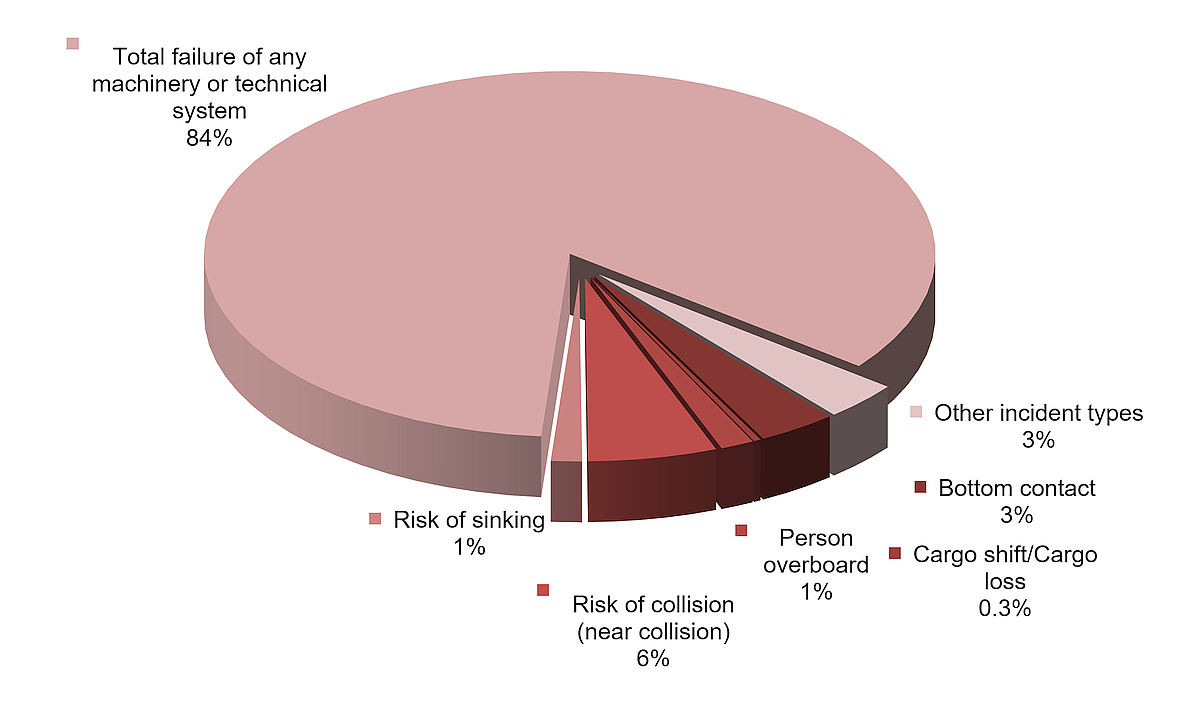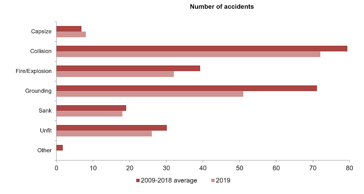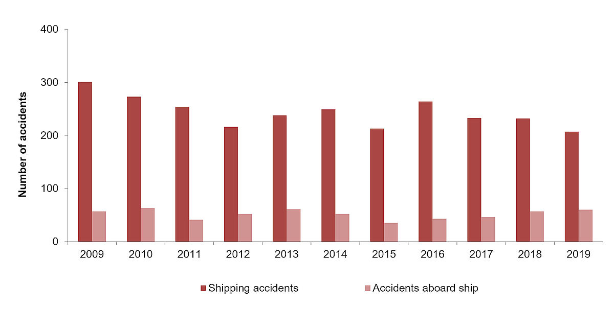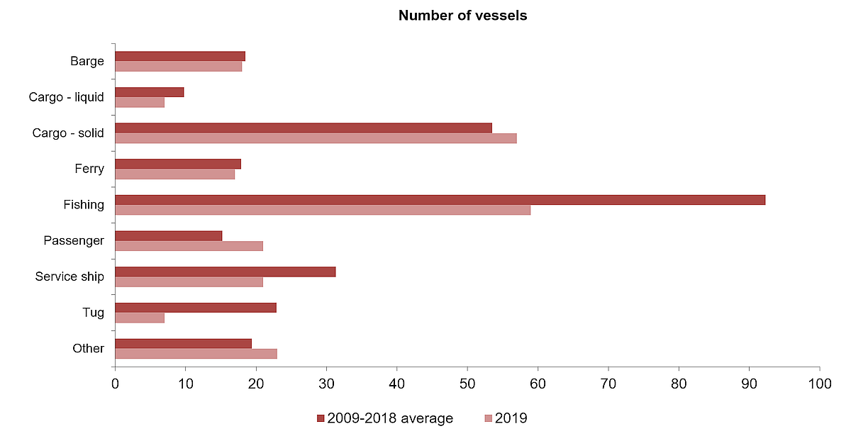 There were 207 shipping accidents in 2019, down from the 2018 total of 232 and down 16% from the 2009–2018 average of 247. The majority of shipping accidents involved fishing vessels (29%), followed by solid-cargo vessels (27%).