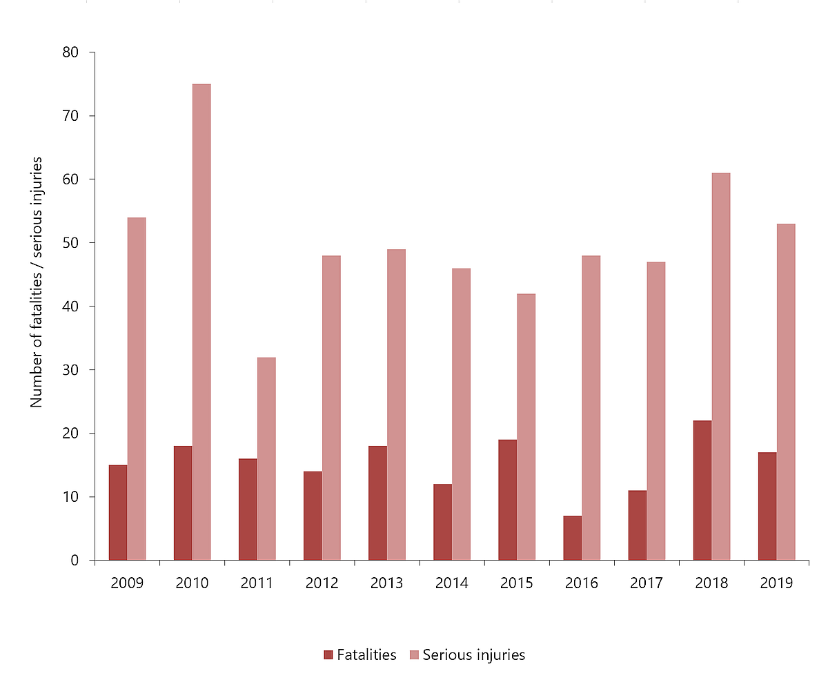 Serious injuries in 2019 totalled 53, down from 61 in 2018 and similar to the annual average of 50 from 2009 to 2018. Forty-three of the 53 serious injuries (81%) resulted from accidents aboard ship, and the remaining 10 resulted from shipping accidents.