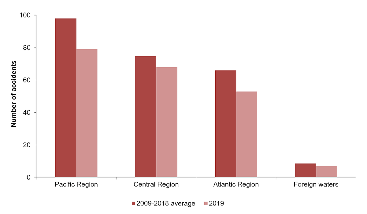 Thirty-five fishing vessels were involved in shipping accidents in the Atlantic region, which is below the 2009–2018 average of 47 fishing vessels. Twenty-three fishing vessels were involved in shipping accidents in the Pacific region, below the 2009–2018 average of 36 fishing vessels (Table 2).