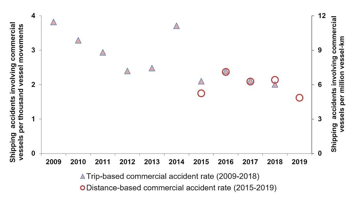 According to information provided by Transport Canada, marine activity for Canadian commercial non-fishing vessels over 15 gross tons (GT) (excluding passenger vessels and cruise ships) was 14 185 thousand commercial vessel-km in 2019, which is 12% above the 2015–2018 average.Footnote 3 This yields a rate of 4.9 shipping accidents per million commercial vessel-km in 2019, lower than the prior 4-year average of 6.3. (Note that a 5-year series is too short to test for trends.)