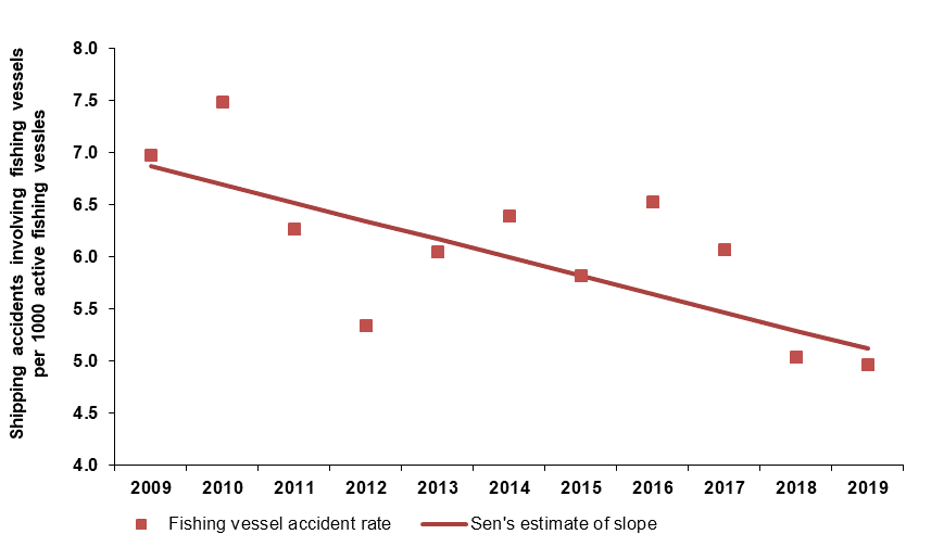 | Year | Fishing vessel accident rate | Sen's estimate of slope |