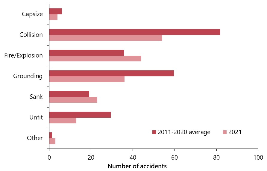 In 2021, there were 43 accidents aboard ship, unchanged from 43 in 2020 and down from the 2011–2020 average of 50. The majority of accidents aboard ship occurred on fishing vessels (53%) and cargo/tanker vessels (30%) (data not shown).