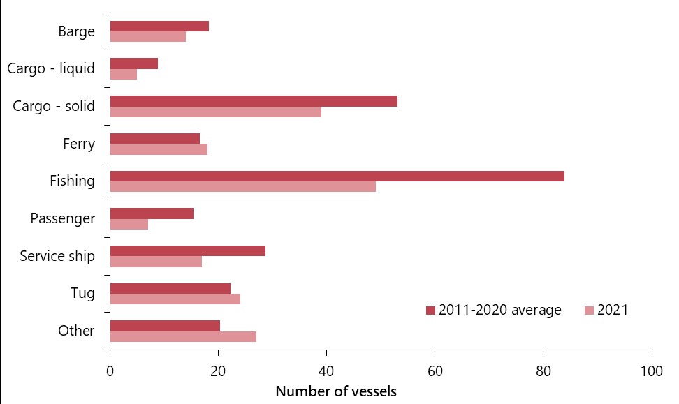 Forty-nine fishing vessels were involved in shipping accidents in 2021, down from 77 in 2020 and down from the 2011–2020 average of 84 (Figure 4). Fishing vessels represented one-quarter of all vessels involved in shipping accidents.