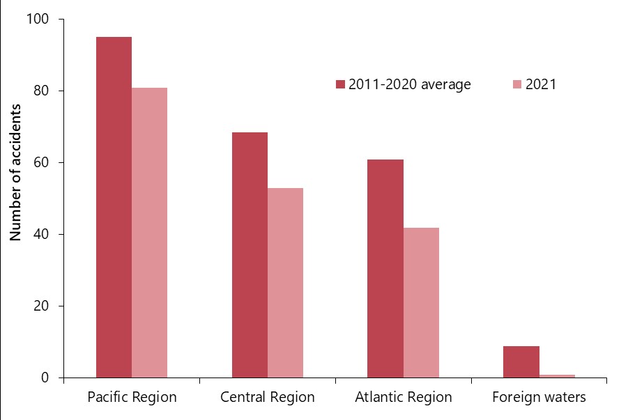 In 2021, 46% of shipping accidents occurred in the Pacific region, 30% in the Central region, and 24% in the Atlantic region. Less than 1% of shipping accidents were in foreign waters.Footnote 2 In the Pacific region in 2021, shipping accidents were 15% below the 2011–2020 average, in the Central region shipping accidents were 23% below the 2011–2020 average, and in the Atlantic region shipping accidents were 31% below the 2011–2020 average (Figure 5).