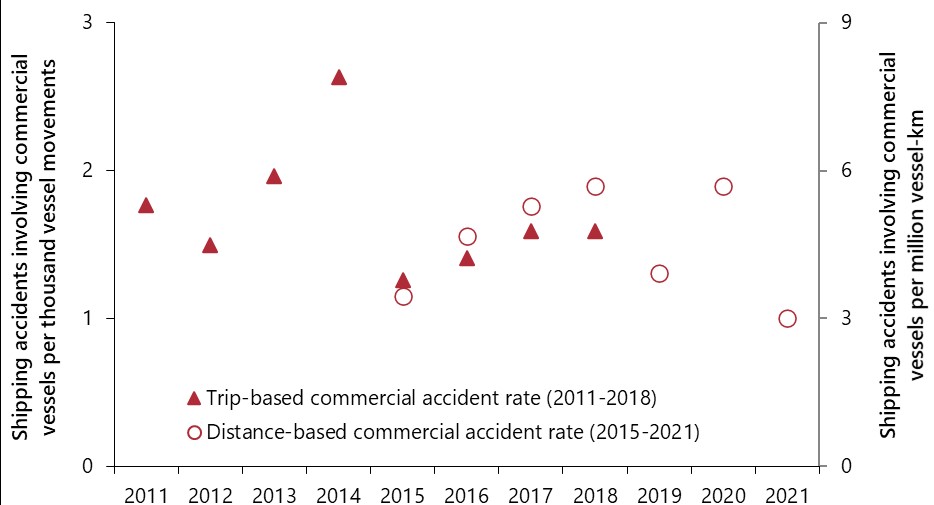 According to information provided by Transport CanadaFootnote 3, marine activity for Canadian commercial non-fishing vessels over 15 gross tons (GT) (excluding passenger vessels and cruise ships) was 12 309 thousand commercial vessel-km in 2021, which is 7% above the 2015–2020 average.Footnote 4 This yields a rate of 3.0 shipping accidents per million commercial vessel-km in 2021, lower than the prior 6-year average of 4.8. (Note that a 7-year series is too short to test for trends.)