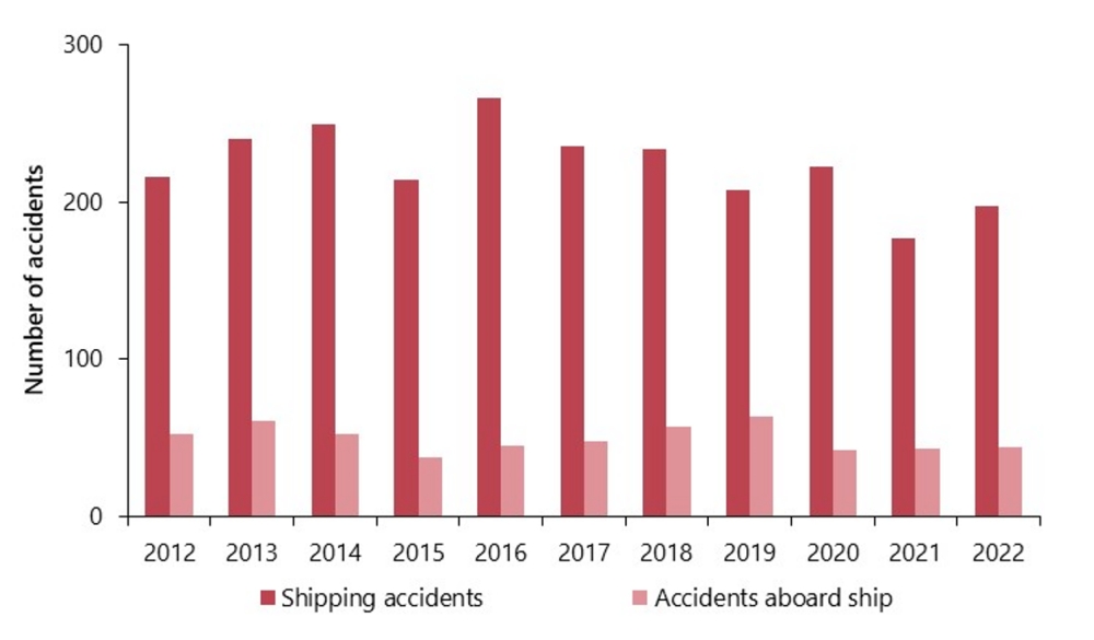 There were 197 shipping accidents in 2022, up from the 2021 total of 177 but down 13% from the 2012 to 2021 average of 226. The majority of shipping accidents involved fishing vessels (30%), followed by solid cargo vessels (23%) (data not shown).