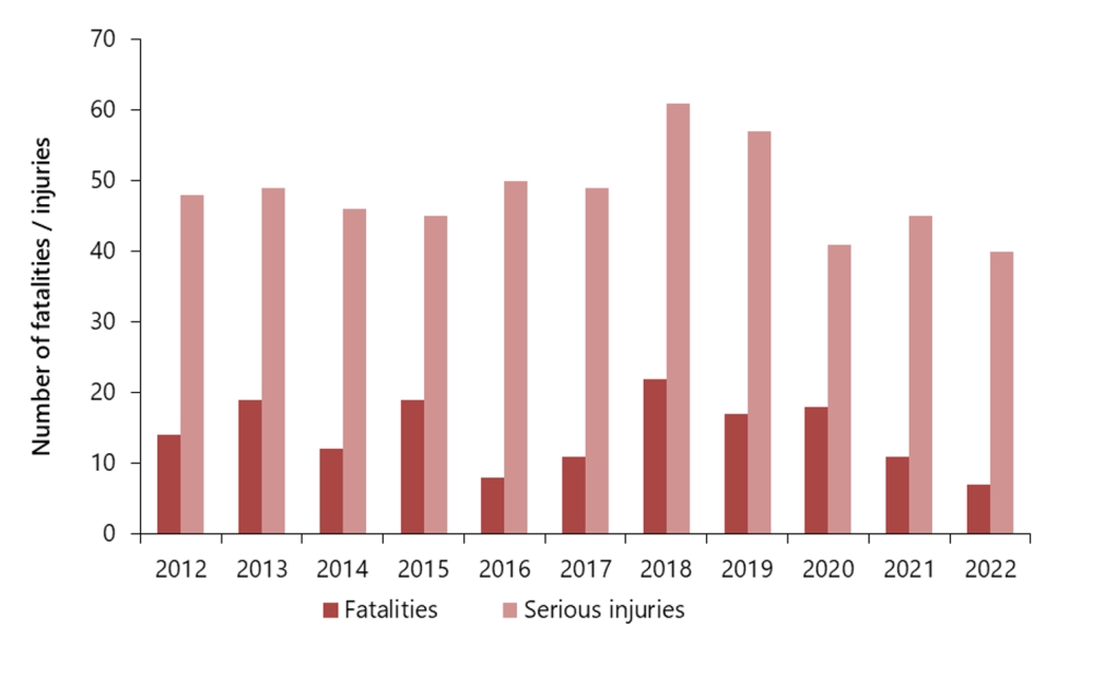 Serious injuries in 2022 totalled 40, down from 45 in 2021 and down from the annual average of 49 from 2012 to 2021. Thirty-three of the 40 serious injuries (83%) resulted from accidents aboard ship, and 7 resulted from shipping accidents.