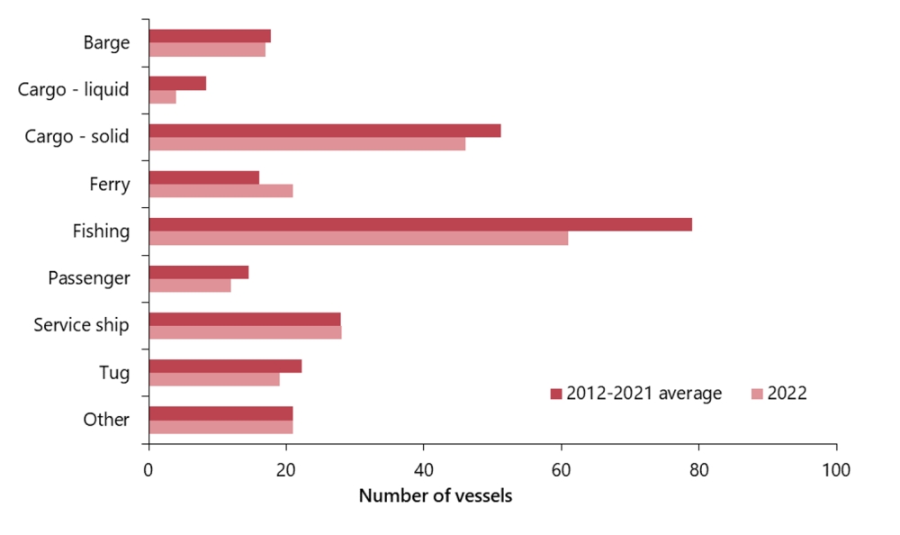 Sixty-one fishing vessels were involved in shipping accidents in 2022, up from 49 in 2021 but down from the 2012 to 2021 average of 79 (Figure 4). Fishing vessels represented 27% of all vessels involved in shipping accidents.