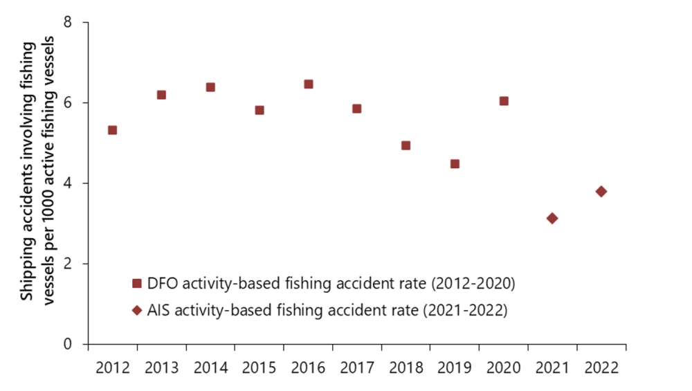 | Year | Fishing accident rate, DFO vessel counts (2012-2020) | Fishing accident rate, AIS vessel counts (2021-2022) |