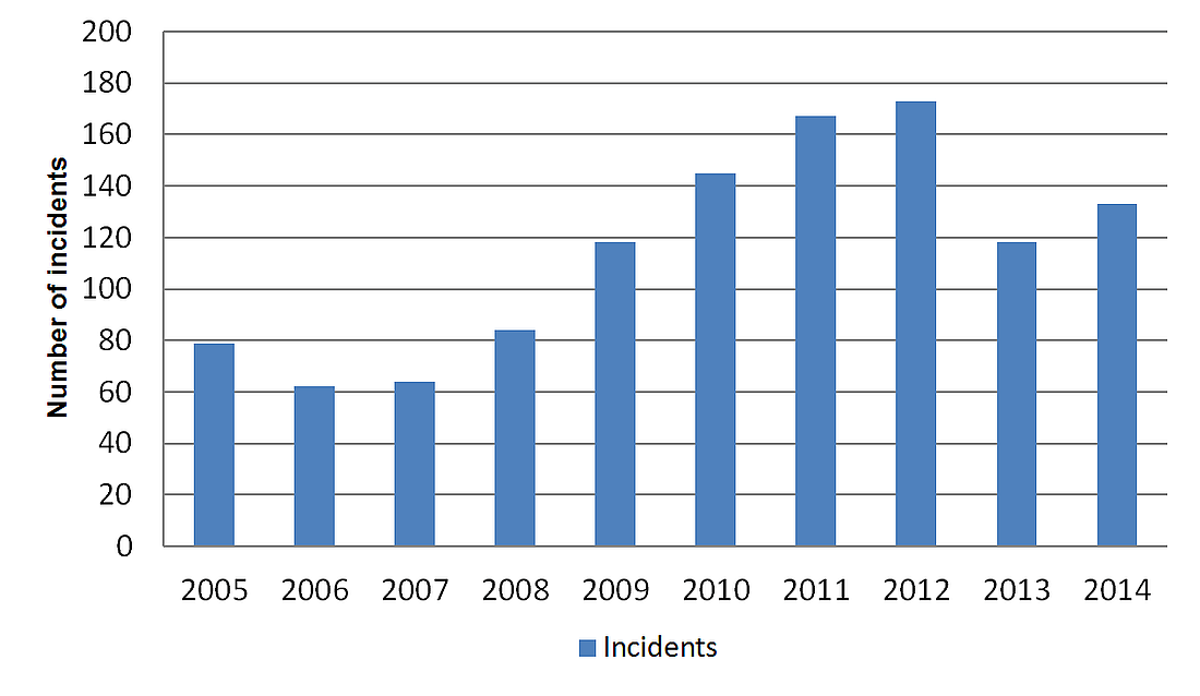 | Incidents* | 72 | 56 | 56 | 69 | 96 | 129 | 147 | 154 | 100 | 104 |