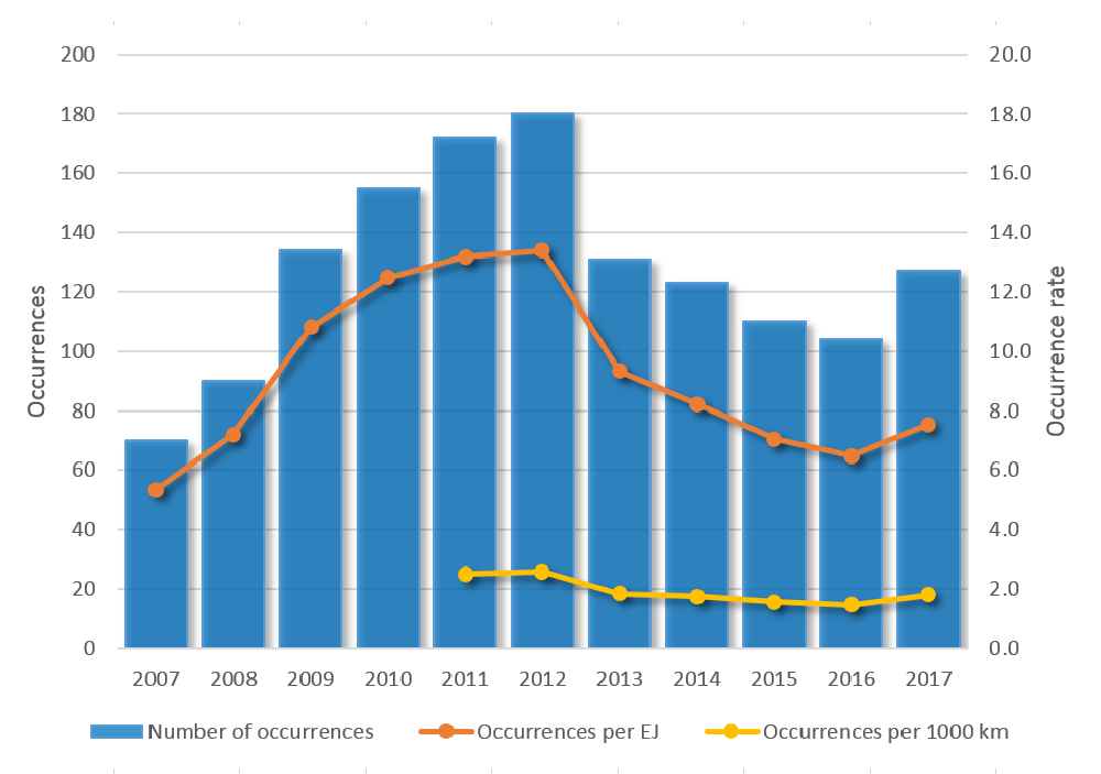 | Year | Number of occurrences | Occurrences per EJ | Occurrences per 1000 km |
