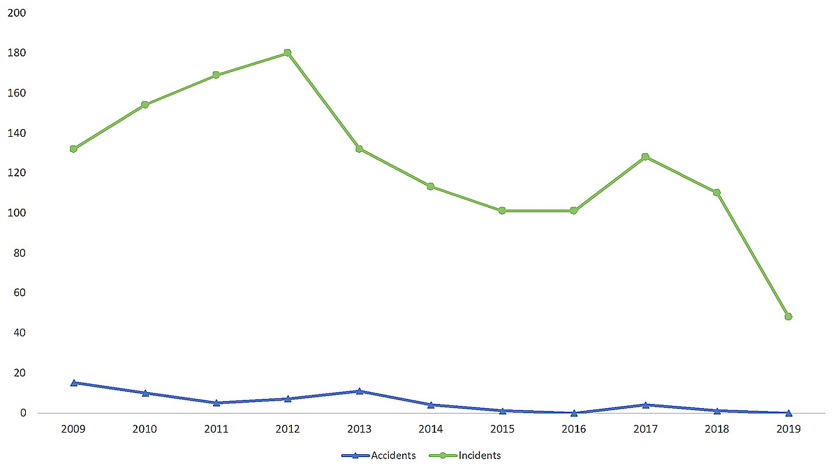 It should be noted that certain characteristics of the data constrain statistical analysis and identification of emerging trends. These include the small totals of accidents and incidents, the large variability in the data from year to year, and changes to regulations and definitions over time. The reader is cautioned to keep these limitations in mind when viewing this summary to avoid drawing conclusions that cannot be supported by statistical analysis.