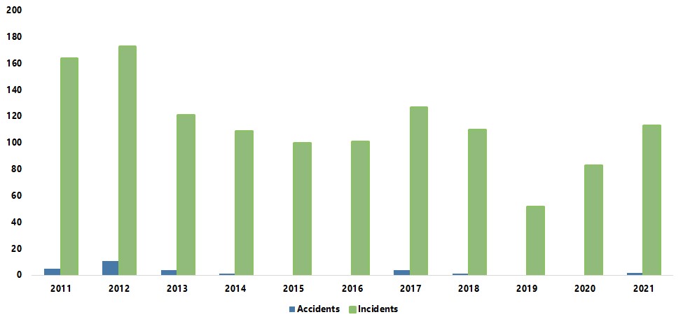 In 2021, 115 pipeline transportation occurrences were reported to the TSB (Table 1 and Figure 1). This number is similar to the average number of occurrences for the previous 10 years (117 occurrences) and is the highest number of occurrences since 2017 (when there were 131 occurrences). Fluctuations to the reported numbers over this period may have resulted from various factors, including changes to regulations and definitions. Among all occurrences in 2021, two were accidents; these were the first accidents since 2018 (when there was one accident) and the most accidents since 2017 (when there were four accidents). From 2011 to 2020, however, there was an average of three accidents per year.