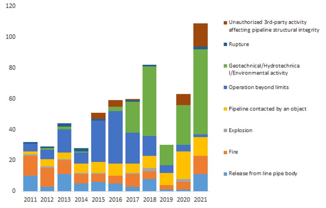 | Year | Release from line pipe body | Fire | Explosion | Pipeline contacted by an object | Operation beyond limits | Geotechnical/Hydrotechnica l/Environmental activity | Rupture | Unauthorized 3rd-party activity affecting pipeline structural integrity |
