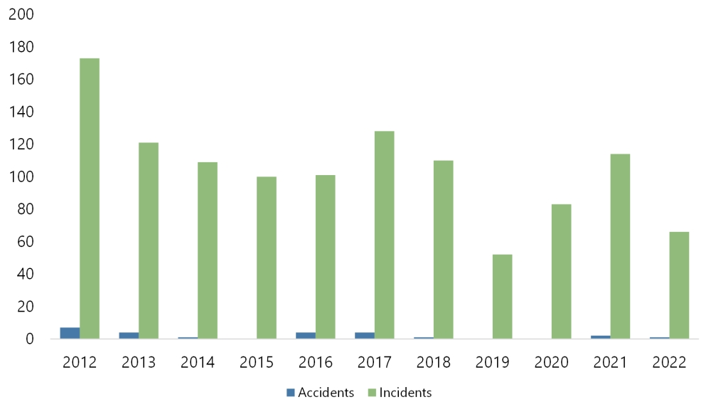 There were 13 incidents of pipelines being contacted by an object in 2022 compared with the average of 8 such reports per year during the previous 10 years; there were also 6 incidents where “unauthorized third-party activity affects pipeline structural integrity,” compared with an average of 3 incidents per year over the previous 10 years. Eight incidents involved “operation of the pipeline beyond limits”, well below the average of 13 occurrences of this type between 2012 and 2021. In 2022, 8 fires were reported (1 accident and 7 incidents), slightly above the average of 7 per year for the previous 10 years. Of these, 1 accident and 1 incident in 2022 were reported as involving both fire and explosion.