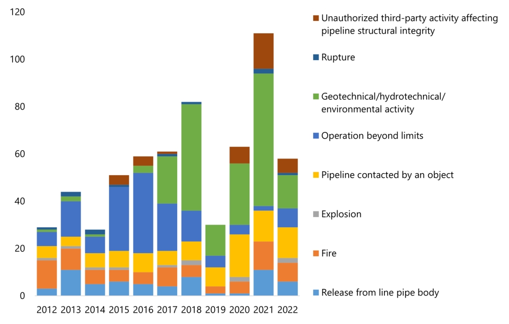 | Year | Release from line pipe body | Fire | Explosion | Pipeline contacted by an object | Operation beyond limits | Geotechnical/hydrotechnical/ environmental activity | Rupture | Unauthorized third-party activity affecting pipeline structural integrity |