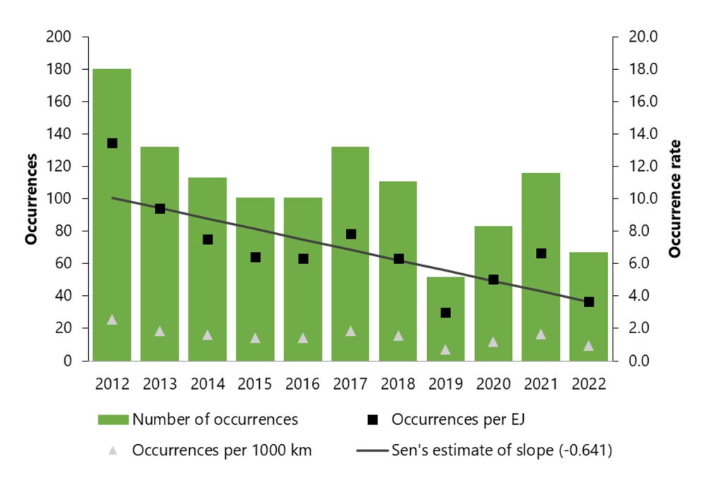 | Year | Number of occurrences | Occurrences per EJ | Occurrences per 1000 km | Sen's estimate of slope (-0.641) |