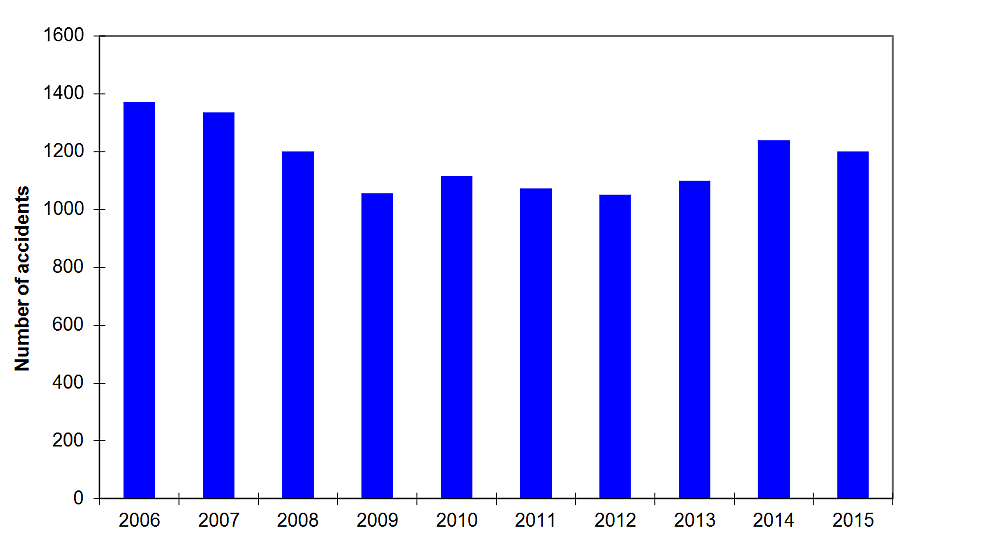 In 2015, 1200 rail accidents Footnote 1 were reported to the TSB (Figure 1), a 3% decrease from the 2014 total of 1238 but an 8% increase from the 2010–2014 average of 1115.