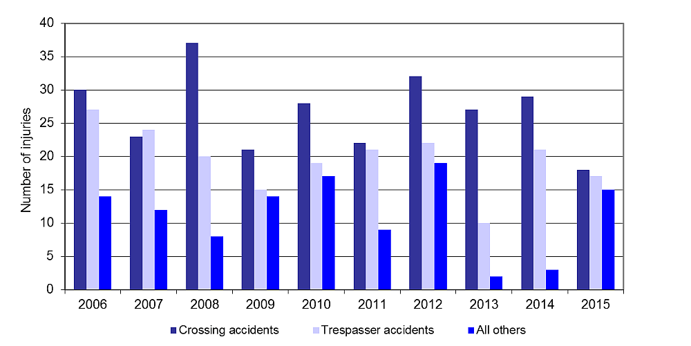 Crossing accidents represented one of the more serious types of rail accidents in 2015, with 18% of these resulting in either serious or fatal injuries.