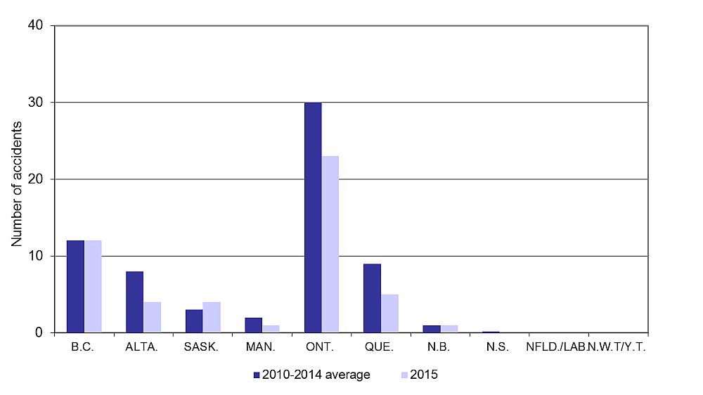 In 2015, Ontario accounted for 46% of trespasser accidents (23), followed by British Columbia with 24%. Quebec accounted for 10% of all trespasser accidents, followed by Alberta and Saskatchewan with 8% each (Figure 10).