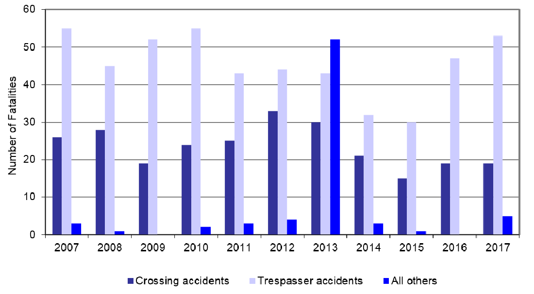 | Year | Crossing accidents | Trespasser accidents | All others |