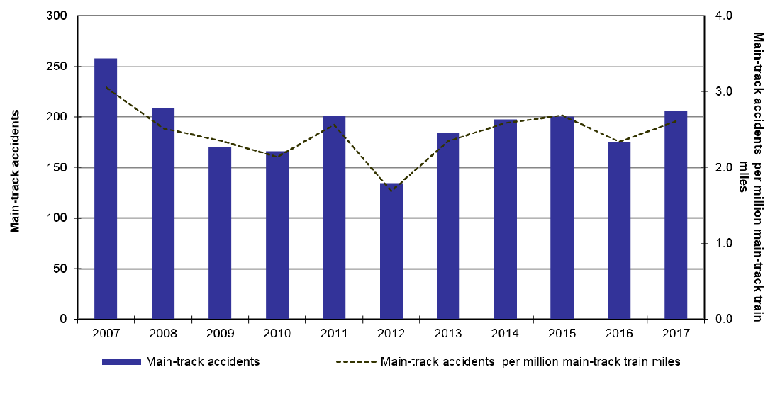 | Year | Main-track accidents | Main-track accidents per million main-track train miles |