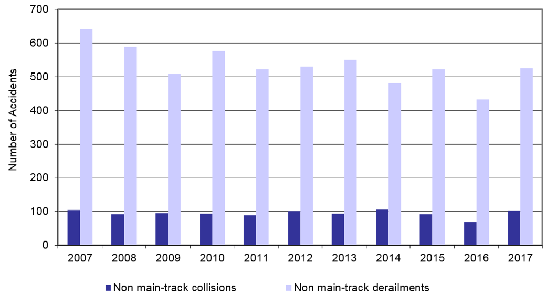 The largest proportion of reported rail accidents comprised non-main-track derailmentsFootnote 2 and collisions (58%) (Figure 2). Typically, most non-main-track accidents are minor, occurring during switching operations at speeds of less than 10 mph. In fact, non-main-track derailments and collisions that do not result in serious injury or damage are now (since 2014) classified as reportable incidents.
