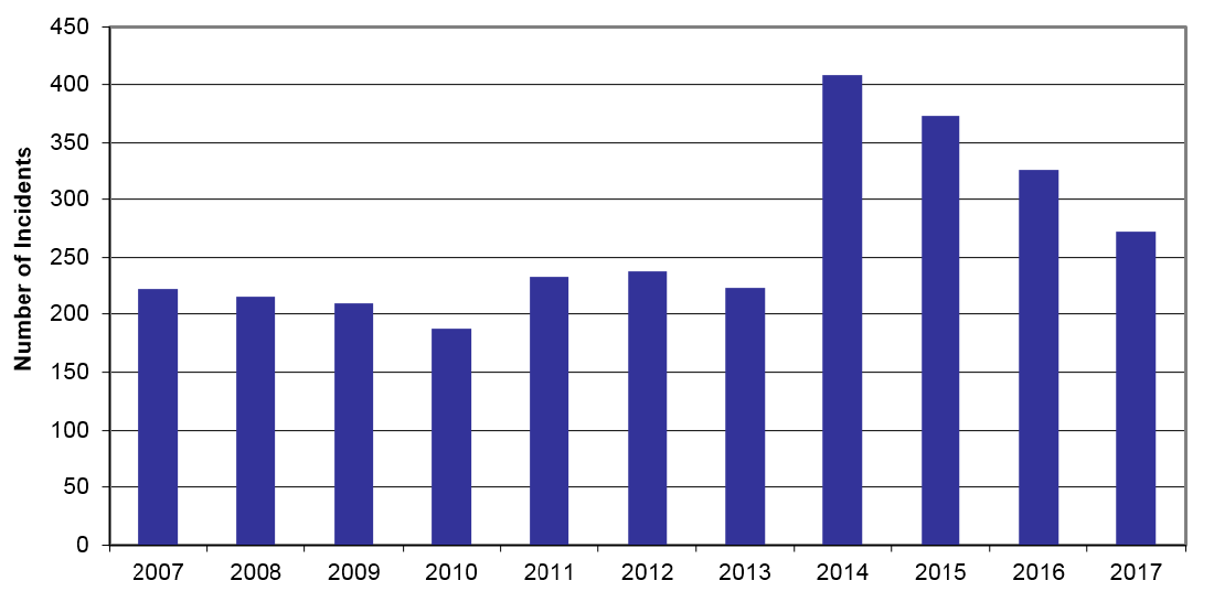 In 2017, 115 accidents involved dangerous goodsFootnote 5, up from 101 in 2016 but below the 10-year average of 138. Four accidents resulted in a dangerous goods release in 2017, up from 1 in 2016, but consistent with the 10-year average. Two of the 4 accidents resulted in a release of molten sulphur, 1 resulted in a release of sodium chlorate, and 1 resulted in a release of petroleum crude oil.