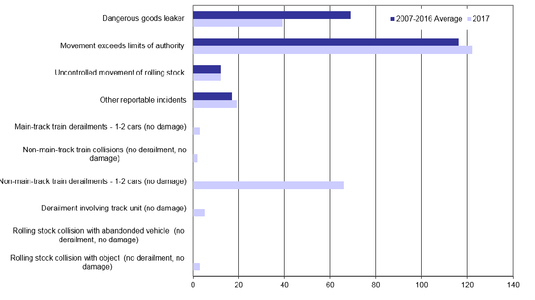 No fatalities or serious injuries resulted from main-track derailments in 2017; but 10 involved the release of dangerous goods, the same number as in 2016 but below the 10-year average of 17. Three of these derailments resulted in release of product (2 molten sulphur, 1 sodium chlorate).