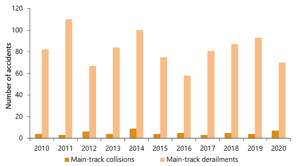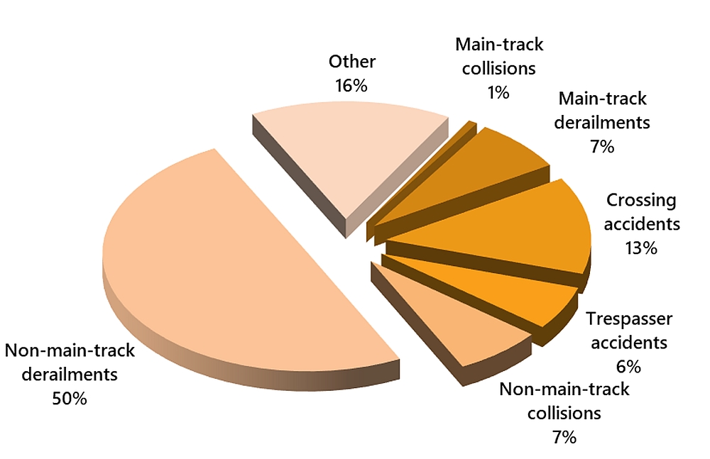 Main-track collisions and derailments are the most serious categories of rail accidents in terms of potential risk to the public and financial loss (e.g., when passenger trains are involved or dangerous goods are released from trains that derail in populated areas).