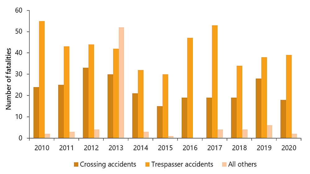 There were 16 fatal crossing accidents in 2020, down from the 26 reported in 2019 and below the 10-year average of 21. Crossing-related fatalities totalled 18 in 2020, down from the 28 reported in 2019 and below the 10-year average of 23.