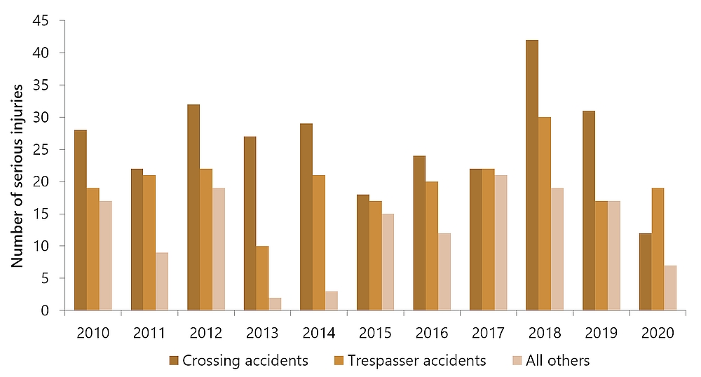 Crossing-related serious injuries totalled 12 in 2020, down from the 2019 total of 31 and below the 10‑year average of 28.