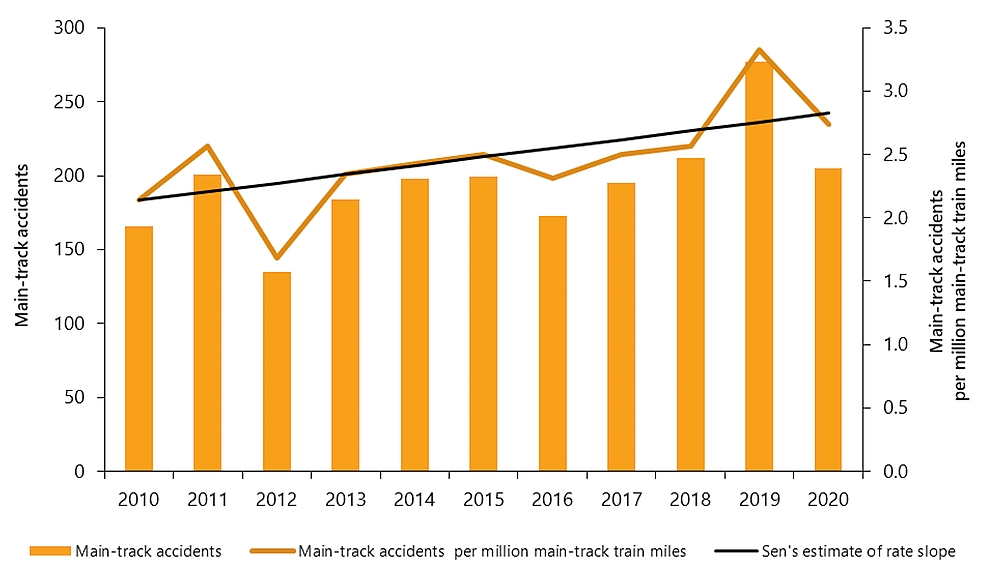 Kendall’s tau-b (τb) correlation and Sen’s estimate of slope were used to quantify the trend in main-track accidents and accident rates shown in Figure 5. Kendall's (τb) correlation coefficient is a nonparametric measure of the strength and direction of association that exists between two variables. Kendall’s τb was calculated on the 11-year series of accident rate values by year from 2010 to 2020. There was a moderately strong, positive correlation that indicates an upward trend in accidents per million main-track train miles over the period (τb = 0.564, p = 0.016). Sen’s estimate of slope, the amount of upward rate change per year, was 0.0687 occurrences per million main-track miles per year.