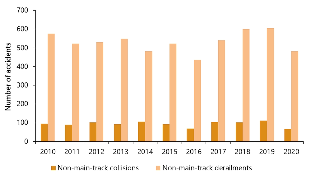 The largest proportion of reported rail accidents comprised non-main-track derailmentsFootnote 2 (50%) (Figure 2). Typically, most non-main-track accidents are minor, occurring during switching operations at speeds of less than 10 mph.
