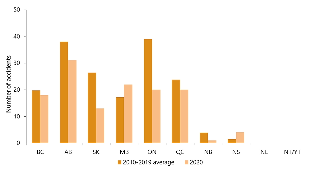 Alberta had the highest proportion (24%) of all crossing accidents in 2020, above its 10-year average of 22%. Manitoba had the second highest total with 17% of crossing accidents, followed by Quebec and Ontario with 16% each, and British Columbia with 14% (Figure 9).